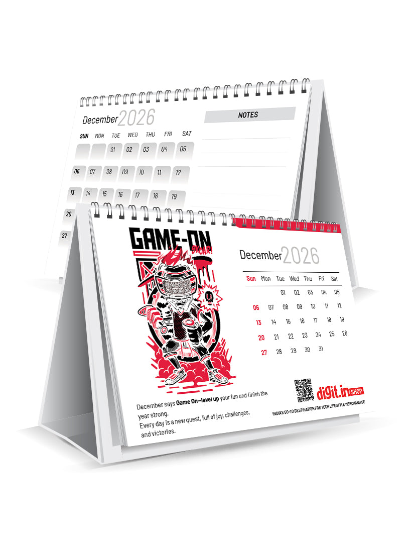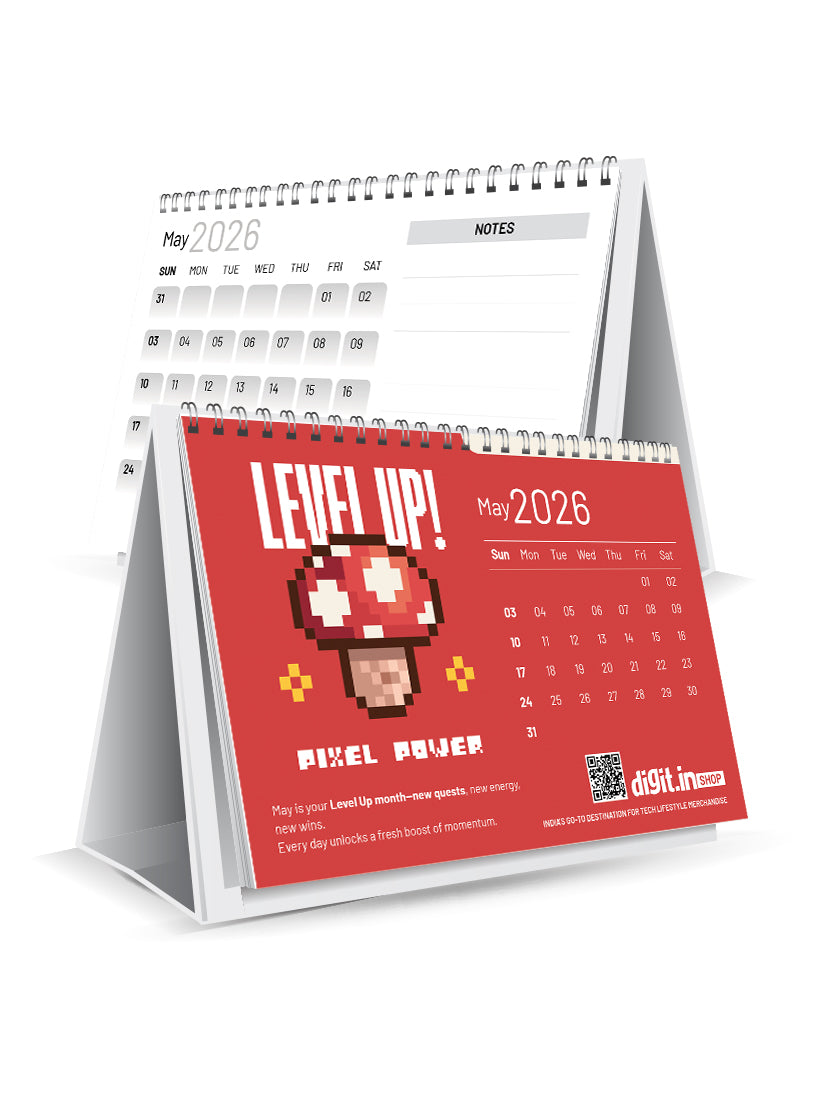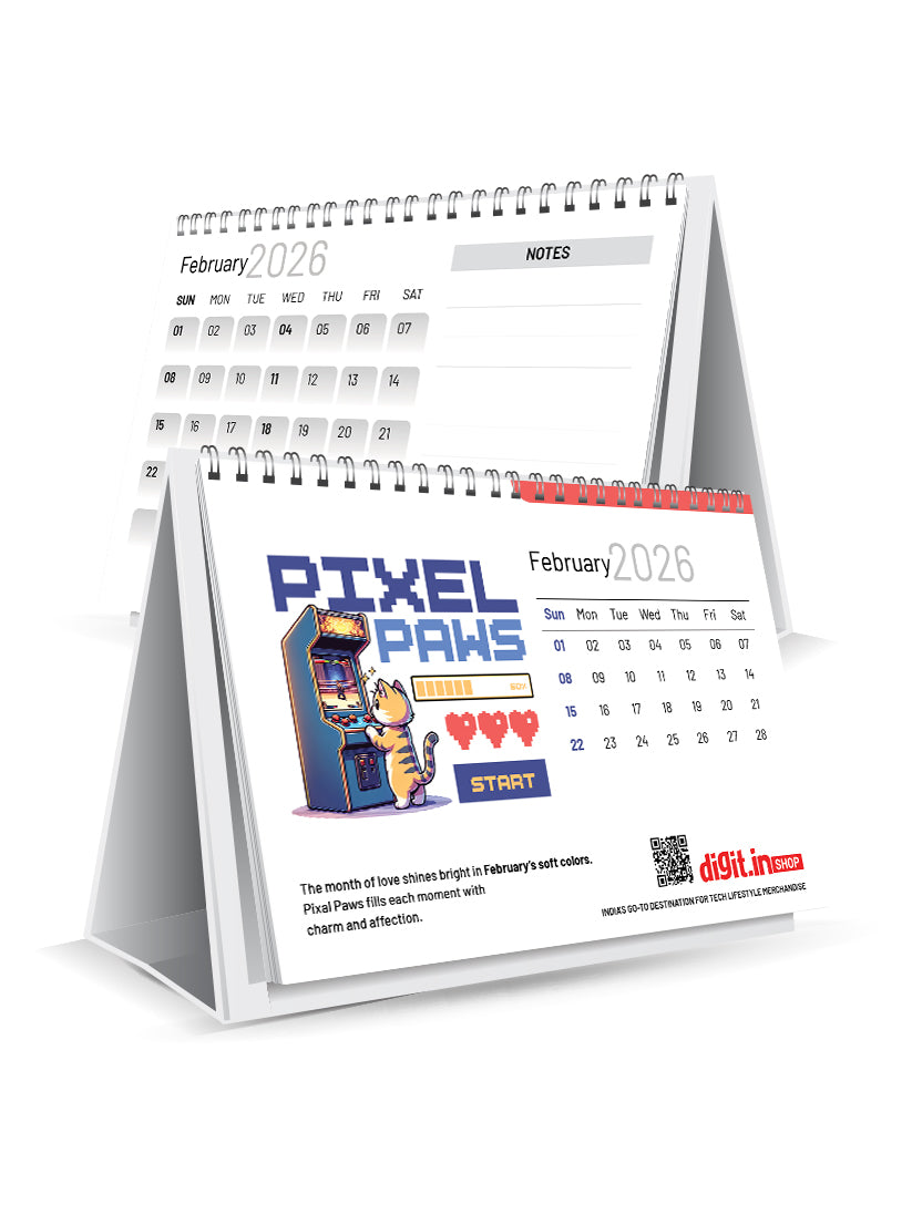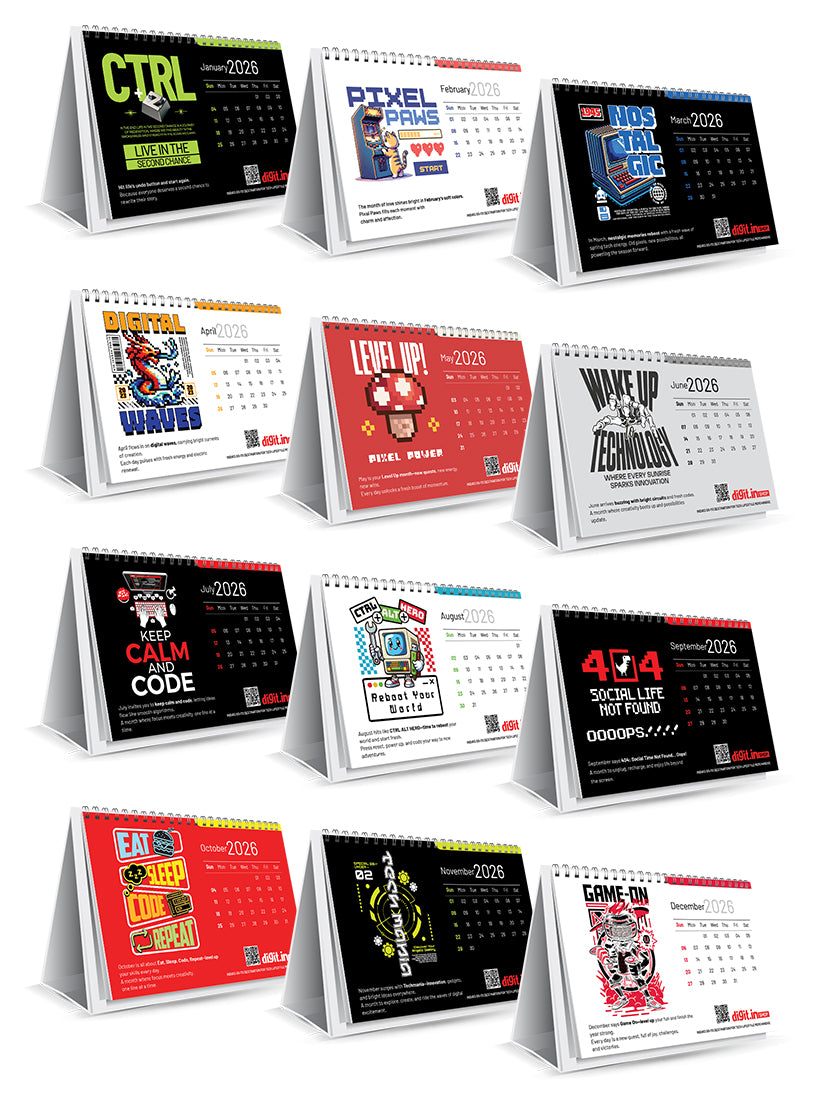 The 2026 Digit Tech Desk Calendar packs 12 months of pure geek energy with your favorite designs — from "Level Up Pixel Power" and "Pixel Paws Start" to "404 Social Life Not Found," "Digital Waves," "Ctrl+Alt+Hero," and more.
